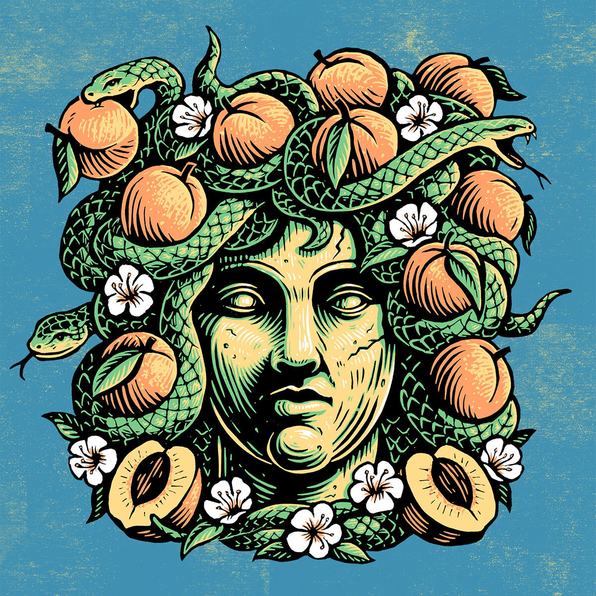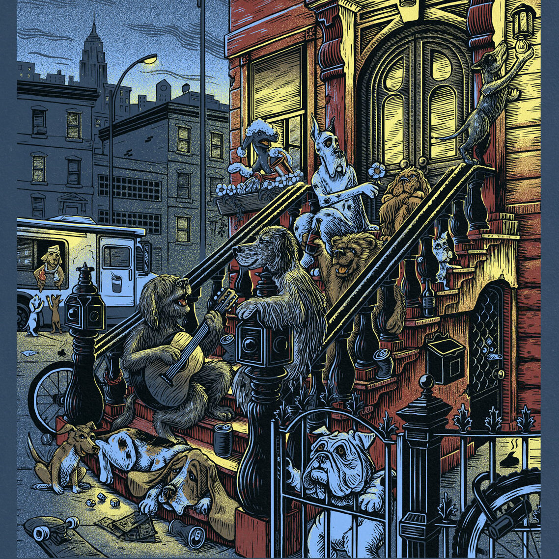 Dylan Goldberger is a Brooklyn based printmaker and illustrator known for blending traditional relief printmaking, screen printing, and digital drawing. His work centers on characters in dynamic, story driven scenes, often drawing inspiration from subcultures like skateboarding and classic country music.