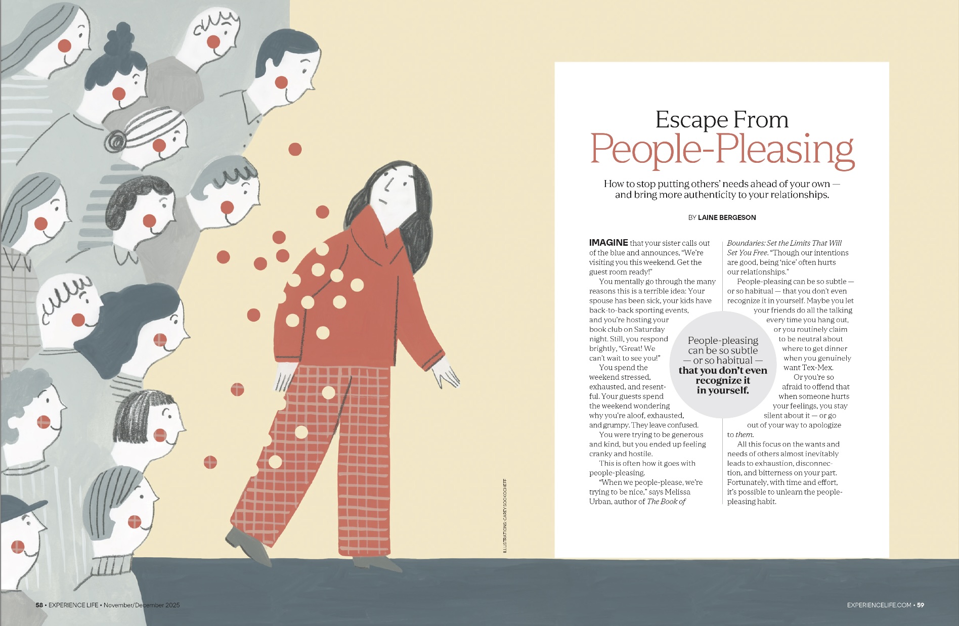 Experience Life Magazine commissioned Carey Sookocheff to illustrate a story about how to stop putting others’ needs ahead of your own.