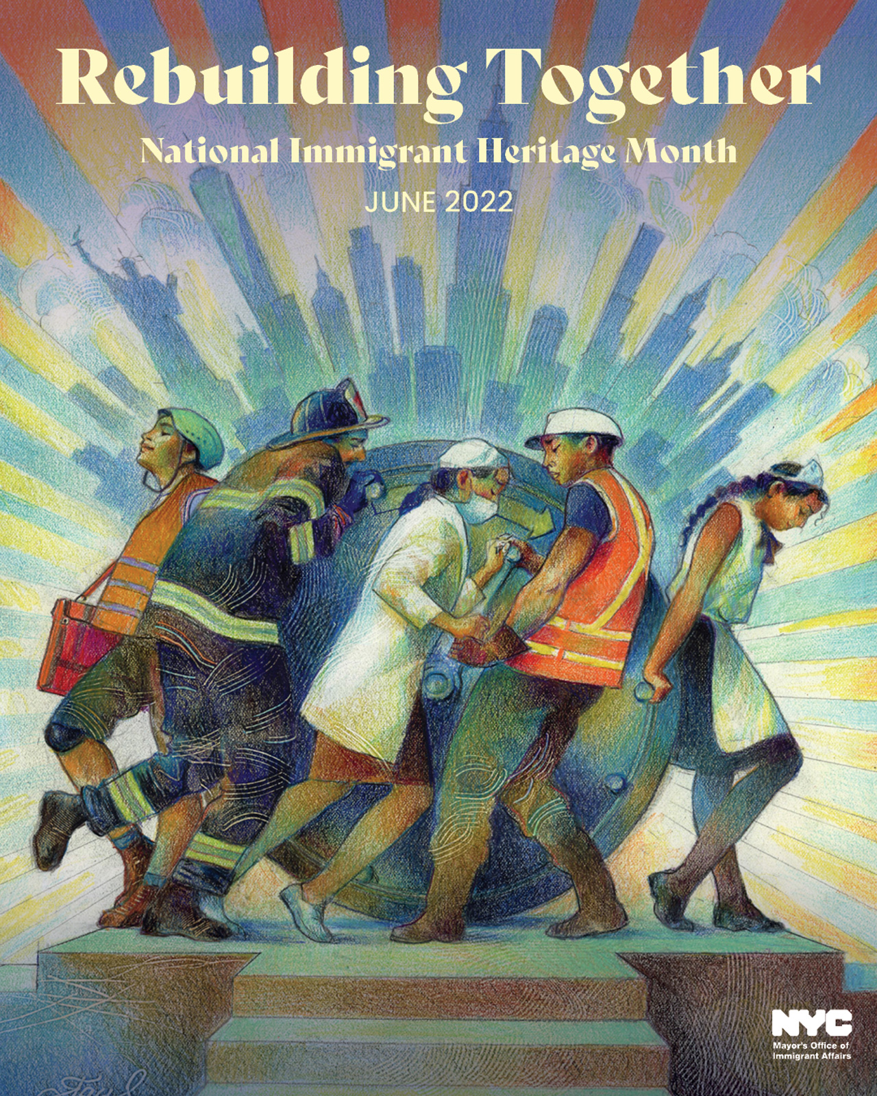 NYC Mayor’s Office of Immigrant Affairs commissioned Raul Colon to illustrate the theme for 2022’s Immigrant Heritage Month. The celebration promoted events designed to recognize the history, traditions, and contributions of NYC’s diverse immigrant communities. Raul was asked to illustrate NYC moving into recovery and beyond from COVID-19, and uplifting immigrants as part of that recovery; many of whom kept the city running throughout the pandemic.